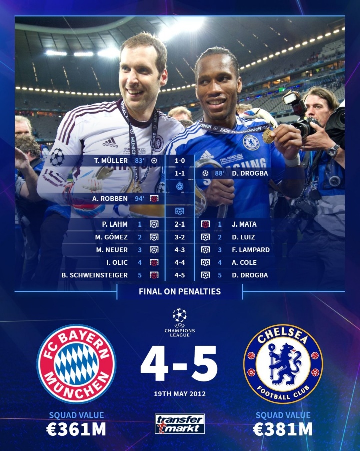 09月17日讯 北京时间明晨3:00,拜仁坐镇安联主场迎战切尔西。赛前,德转官方回顾了2012年切尔西在安联球场力克拜仁夺冠的历史性一役时双方的阵容。