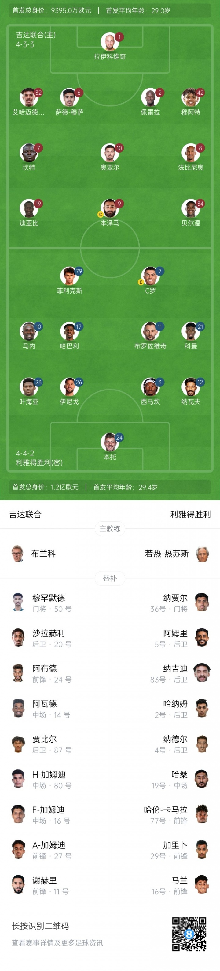 吉达联合首发:1-拉伊科维奇、6-萨德-穆萨、2-佩雷拉、32-朱莱丹、42-穆阿特、8法比尼奥-、7-坎特、10-奥亚尔、19-迪亚比、34-贝尔温、9-本泽马