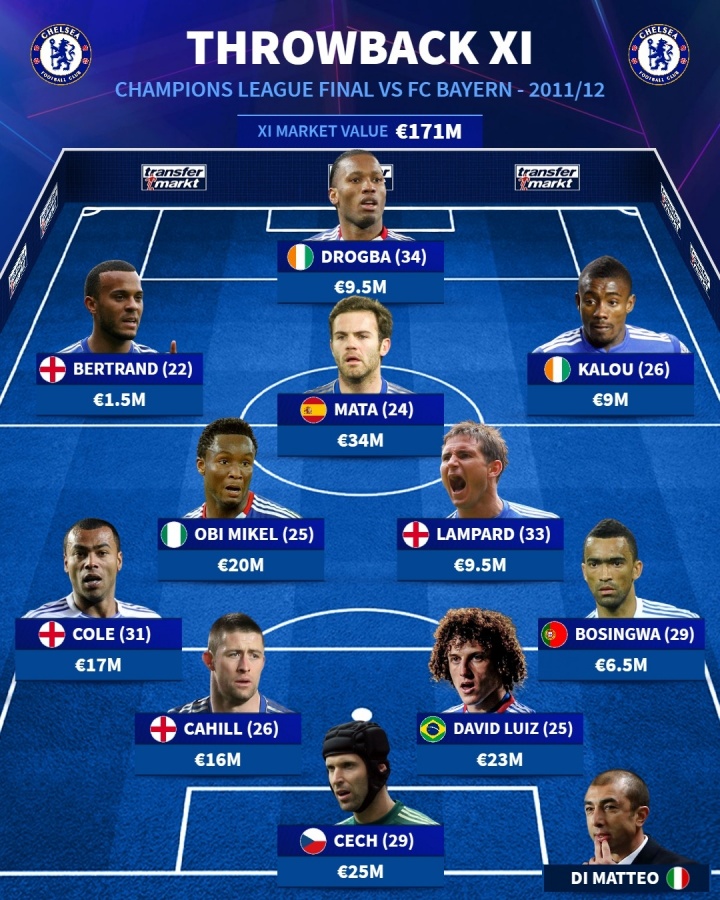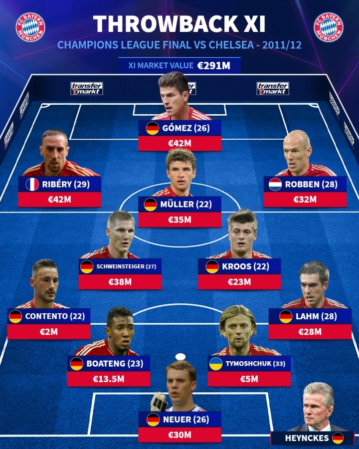 09月17日讯 北京时间明晨3:00,拜仁坐镇安联主场迎战切尔西。赛前,德转官方回顾了2012年切尔西在安联球场力克拜仁夺冠的历史性一役时双方的阵容。