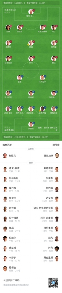 9月22日讯 西甲第5轮,巴萨主场对阵赫塔费,赛前首发公布。